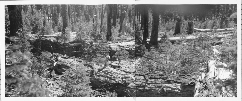 Administrative Collections: Album 5 (Emergency Conservation Works) -Before, during, and after views of roadside and Summit Lake campground cleanup work showing workers and horse teams clearing brush and logs, burning piles of timber and brush from clean up, stacked firewood salvaged from clean up, and areas after clean up