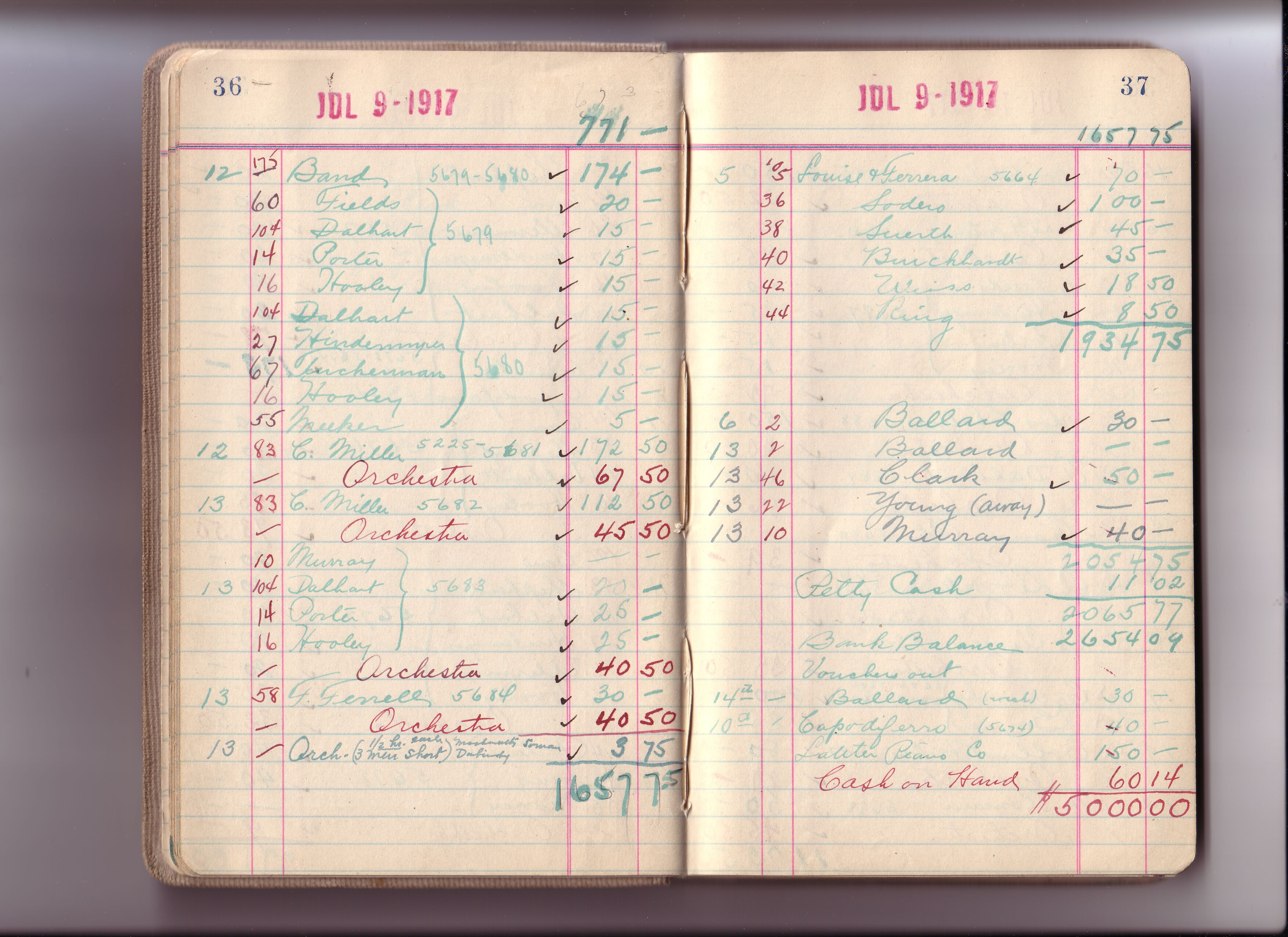 Thomas Edison's New York City Recording Studio Cash Book 15 (of 21), Image 18 (of 73). (Notebook #: PN-17-05-01, NPS catalog #: EDIS 1426), This book documents Diamond Disc matrices 5529 – 6146, expenditures for recording artist fees and other payments authorized by studio manager Walter H. Miller from May 01, 1917 – April 26, 1918. Digitally scanned December 2004 through July 2005 at resolution 300 dpi, 24 bit.