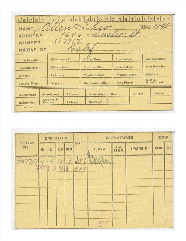 Early twentieth century employee card containing identifying information on the employee, and salary history, from Union Iron Works Co., which had been acquired by Bethlehem Steel Corporation.