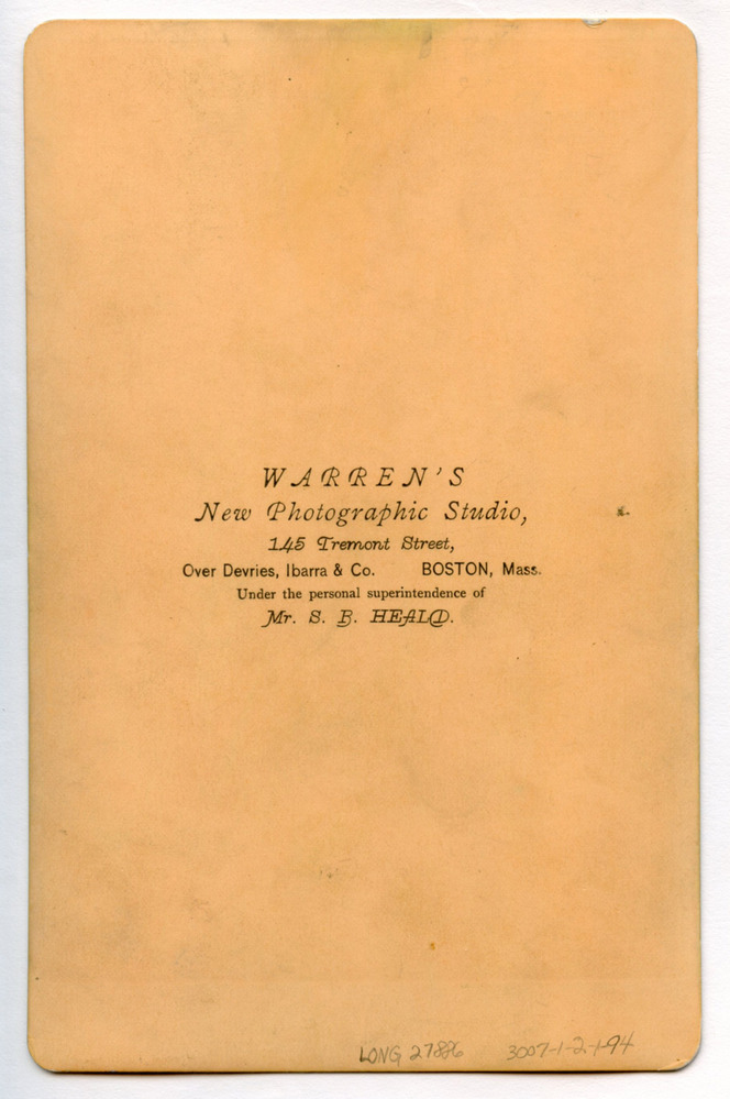 Back of a cabinet card. Front shows an image in an oval. Henry Wadsworth Longfellow three-quarter view to his right. Jacket has silk trim. Inscription: Photographer's imprint includes "Warren's / New Photographic Studio, / 145 Tremont Street . . . Boston, Mass. / Under the personal superintendance of Mr. S. B. Heald." Notes: C1870-C1872. Warren and Heald probably at 145 Tremont Street only a short time before moving (Steele and Polito, Directory of Massachusetts Photographers). Suit resembles those worn by Henry Wadsworth Longfellow in late 1860s.