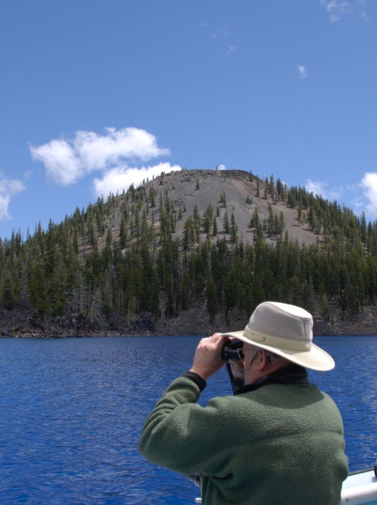 The two hour boat tour around Crater Lake gets park visitors close to Wizard Island. Binoculars are handy to get a closer look!