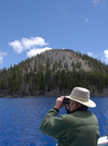 [Alt Text] A park visitor gets a closer look at Wizard Island from the boat tour.