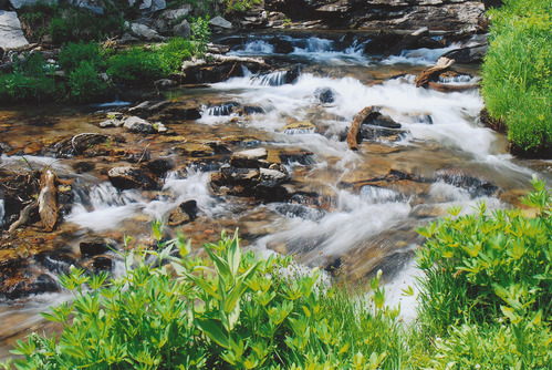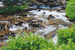 A view of water cascading down tiny waterfalls and rocks in Kings Creek with grass and wildflowers on the banks of the creek.