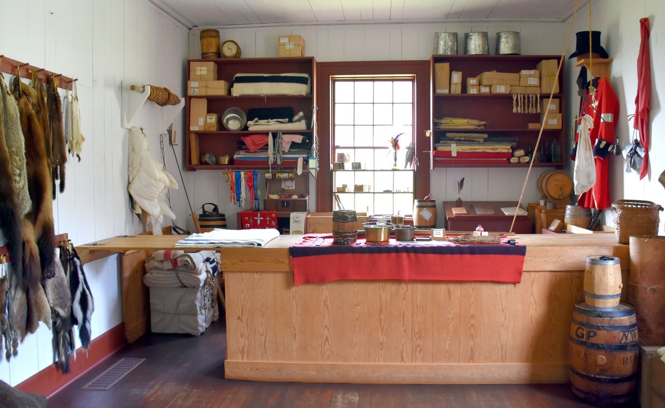 A counter with a red blanket on top and small items displayed. A red fancy coat hangs in the right corner, with swans and furs on the left side.