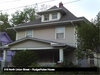 Description: Contributing two- and one-half story wood-frame dwelling; irregular in shape; hipped roof with composition shingles; wood weatherboard siding; double-hung sash vinyl windows; porch with gabled roof and boxed cornice at bellcast gable ends, supported by square tapered columns on brick piers; concrete foundation with daylight basement. This corner lot has small shrubs along the house foundation and shade trees in the yard.