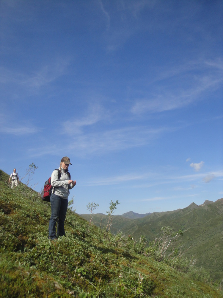 Hikers walking along a brushy mountainside while on a discovery hike