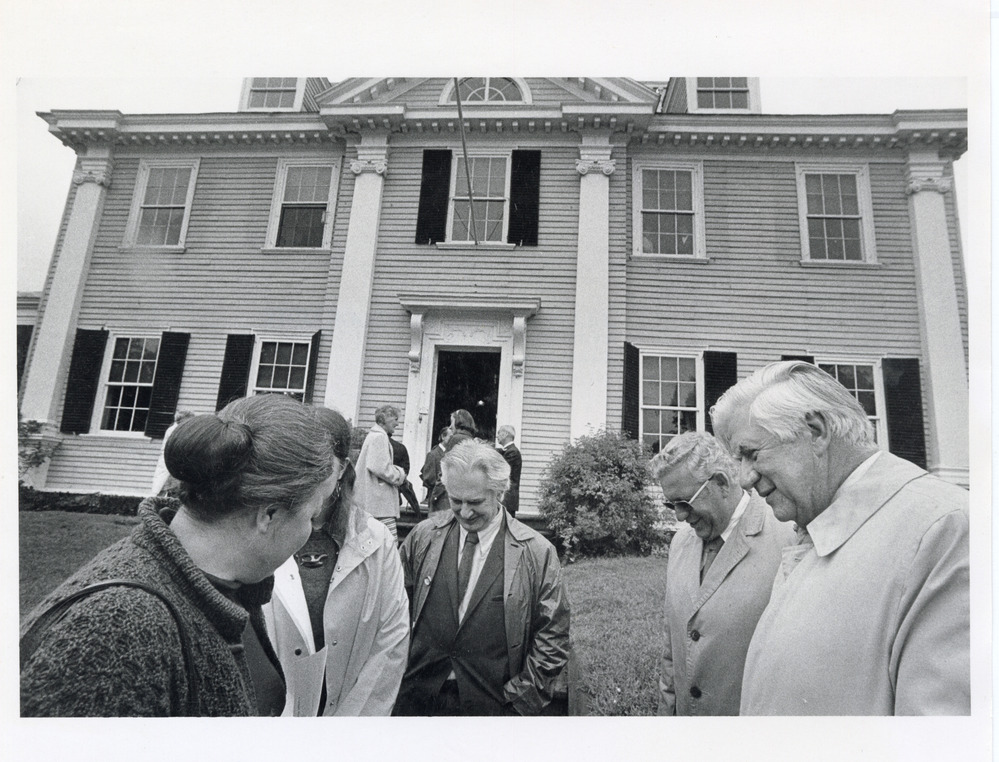 House majority leader Thomas P. O'Neill Jr. (right) and Cambridge Mayor Walter Sullivan on front walk of Longfellow House.