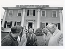 Black and white photograph of group of people gathered on front lawn of large mansion with some missing shutters and open front door.