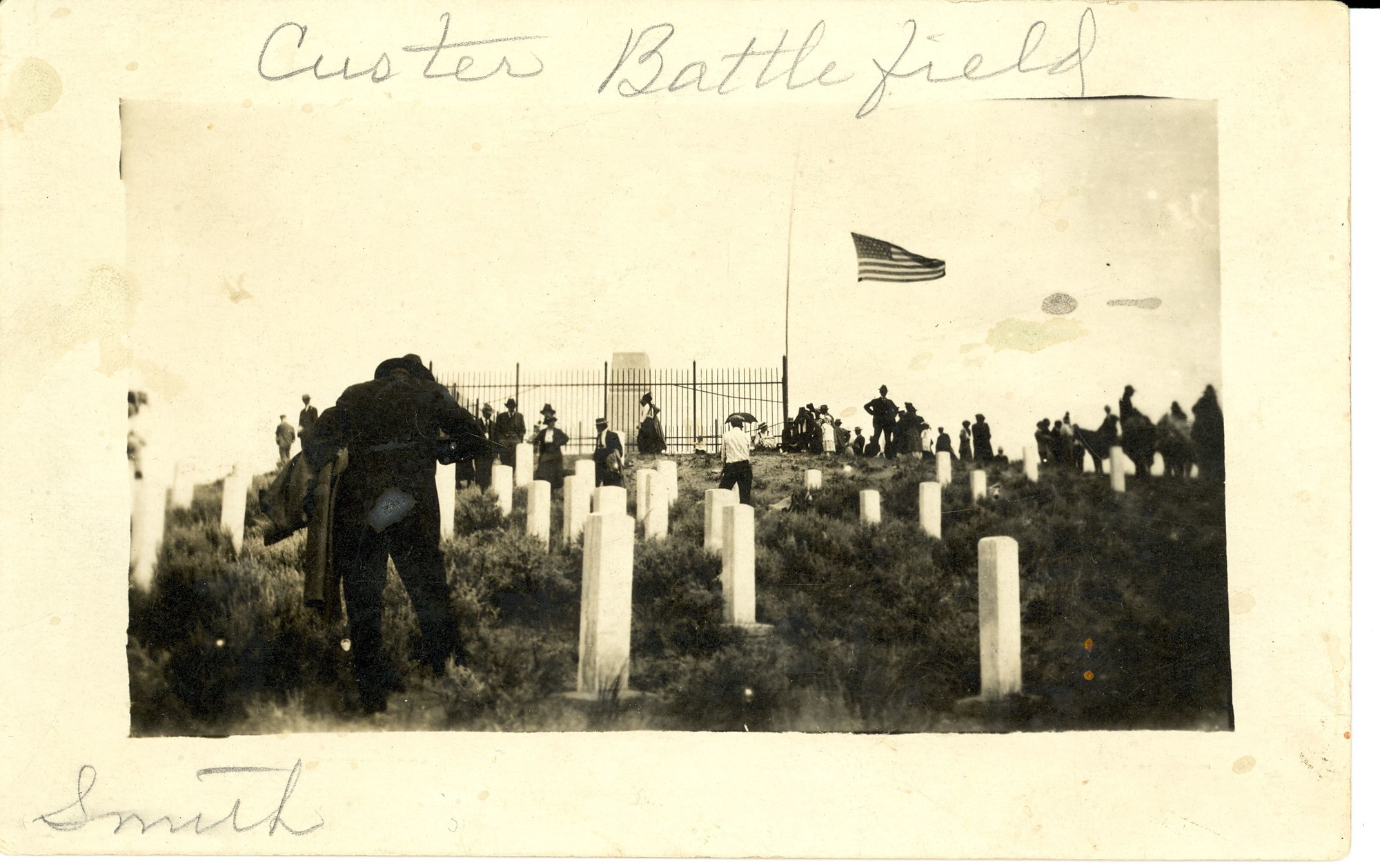 LIBI_00195_06971; Black and white photo postcard. This image depicts people scattered among the markers of the Custer Group on Last Stand Hill. The Custer Monument surrounded by an iron fence is visible in the background. A flag is at half-mast. A handwritten note along the top mount reads: “Custer Battlefield”. The word “Smith” is written in pencil in the left corner of the mount. On verso, a pencil note reads: “Custer Battlefield”. The image was taken by an unknown photographer on an unknown date. There are some stains on it. ; print, photographic; Courtesy of the National Park Service, Little Bighorn Battlefield National Monument, LIBI_00195_06971, Unknown Photographer, "People Among the Custer Group of Markers on Last Stand Hill," date unknown.