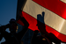 The shadows of two people wearing historic soldier outfits holding the American flag.
