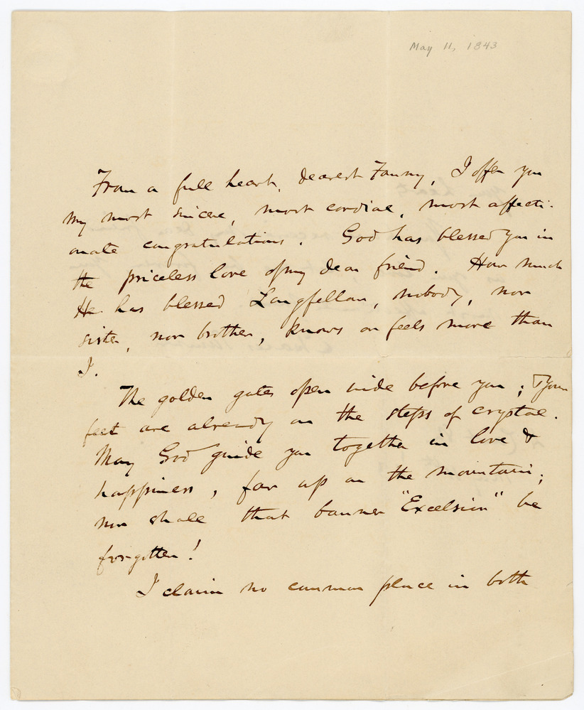 From a full heart, dearest Fanny, I offer you my most sincere, most cordial, most affectionate congratulations. God has blessed you in the priceless love of my dear friend. How much He has blessed Longfellow, nobody, nor sister, nor brother, knows or feels more than I. The golden gates open wide before you; Your feet are already on the steps of crystal. May God guide you together in love and happiness, far up on the mountain; nor shall that banner “Excelsior” be forgotten! I claim no common place in both your hearts. You have received my dear friend as your lover, let me be forever, your most affectionate friend. Charles Sumner