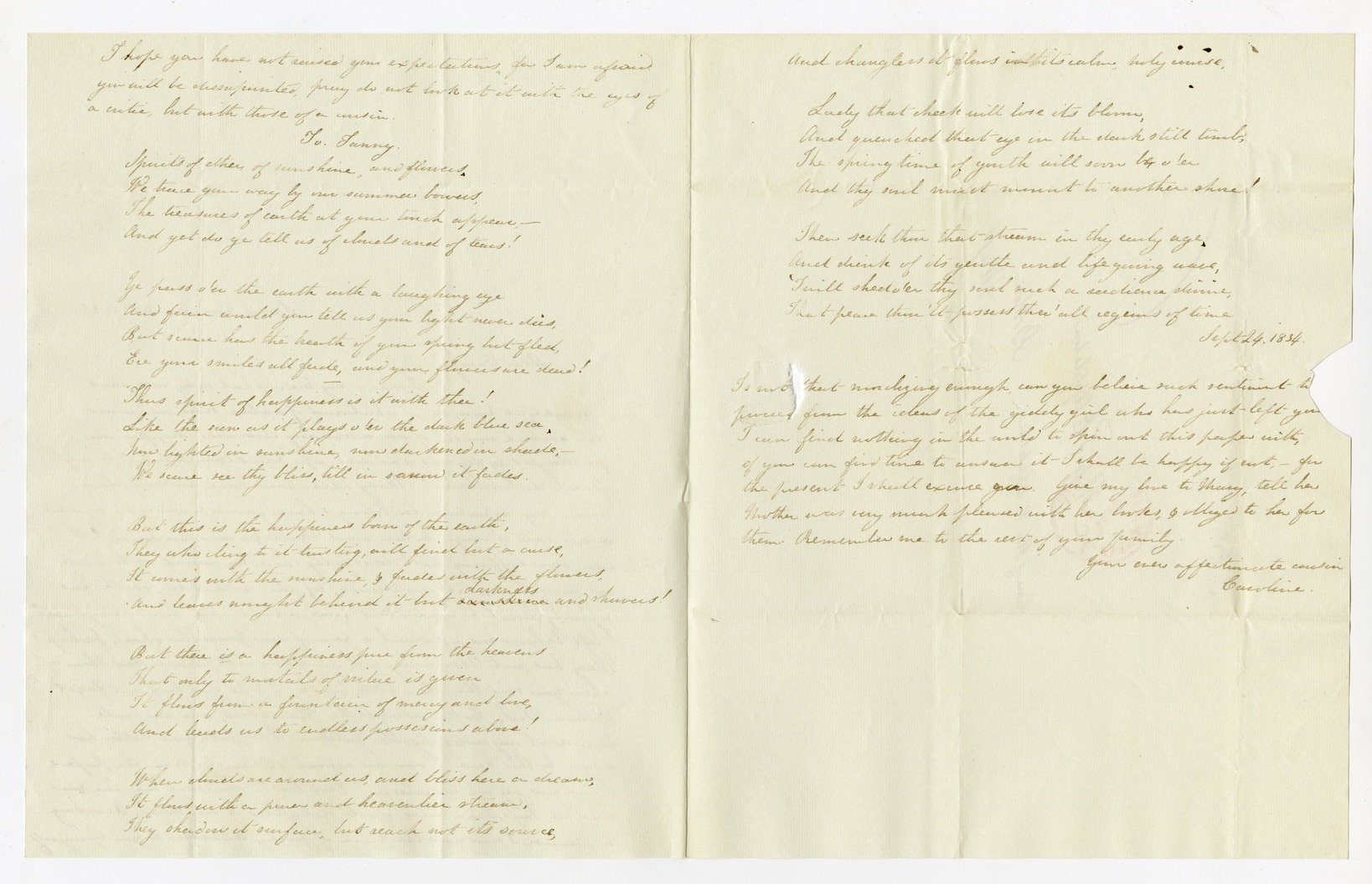 C.F.A. Miss F. E. Appleton Care of Hon. N. Appleton. / Boston / Mass [postmark] LOWELL NOV 15 Mas. [squiggle] Lowell November 12th 1834 Dear Fanny, I made my triumphal entry into this delightful town, in a whirlwind of native sand, and amid the [martial?] music of an advancing caravan! dropped the passengers by degrees and dove up “solus cum solum” to my final destination! Many alterations have taken place since my departure, buildings have gone up and men injured in all sorts of ways, broken arms, skulls, &c in abundance! I have been suffering most dreadfully since my arrival, with quite an unsentimental complaint, viz, the toothacke, [sic] which has certainly aided to render this home arrival still more delightful. I left behind me as usual, a pair of new prunella shoes, perhaps Mary has put them away with yours, you will please send them up when you send the other little bundle, I hope you have not forgot William Tell, Mother admired the Hunchback, and was quite amused at my indefatigable patience. I suppose your brother has arrived by this time I saw his arrival at New York in the papers, I give you joy at his return! Mr & Mrs [A?] Lawrence are here now and the Miss [Turnwhells?], quite delighted to see them. According to promise I send you the piece of poetry addressed to you by myself [page 2] I hope you have not raised your expectations, for I am afraid you will be dissapointed, [sic] pray do not look at it with the eyes of a critic, but with those of a cousin. To. Fanny. Spirits of ether of sunshine, and flowers. We trace your way by our summer bowers, The treasures of earth at your touch appear, -- And yet do ye tell us of clouds and of tears! Ye pass o’er the earth with a laughing eye And fain would you tell us your light never dies, But scarce has the [heath?] of your spring but fled, Ere your smiles all fade, and your flowers are dead! Thus spirit of happiness is it with thee! Like the sun as it plays o’er the dark blue sea. Now lighted in sunshine, now darkened in shade, — We scare see thy bliss, till in sorrow it fades. But this is the happiness born of the earth, They who cling to it trusting, will find but a curse, It comes with the sunshine, & fades with the flowers, And leaves naught behind it but [crossed out: sunshine] ^ darkness and showers! But there is a happiness pure from the heavens That only to mortals of virtue is given It flows from a fountain of mercy and love, And leads us to endless possessions above! When clouds are around us, and bliss here a dream, It flows with a purer and heavenlier stream They shadow it surface, but reach not its source, [page 3]And changless it flows in its calm, holy course, Lady that [?] will lose its bloom, And quenched that eye in the dark still tomb, The spring time of youth will soon be o’er And thy soul must mount to another shore! Then seek there that stream in thy early age, And drink of its gentle and lifegiving wave, ‘Twill sheet o’er thy soul such a radiance divine, That peace then ‘It possess thee’ ‘all regimes of time Sept 24. 1834. Is not[paper ripped] that morilizing [sic] enough, can you believe such sentiment th[paper ripped] pureed from the ideas of the giddy girl who has just left you[paper ripped] I can find nothing in the world to spin out this paper with, if you can find time to answer it I shall be happy if not, - for the present I shall excuse you. Give my love to Mary, tell her Mother was very much pleased with her books, & obliged to her for them. Remember me to the rest of your family. Your ever affectionate cousin Caroline.