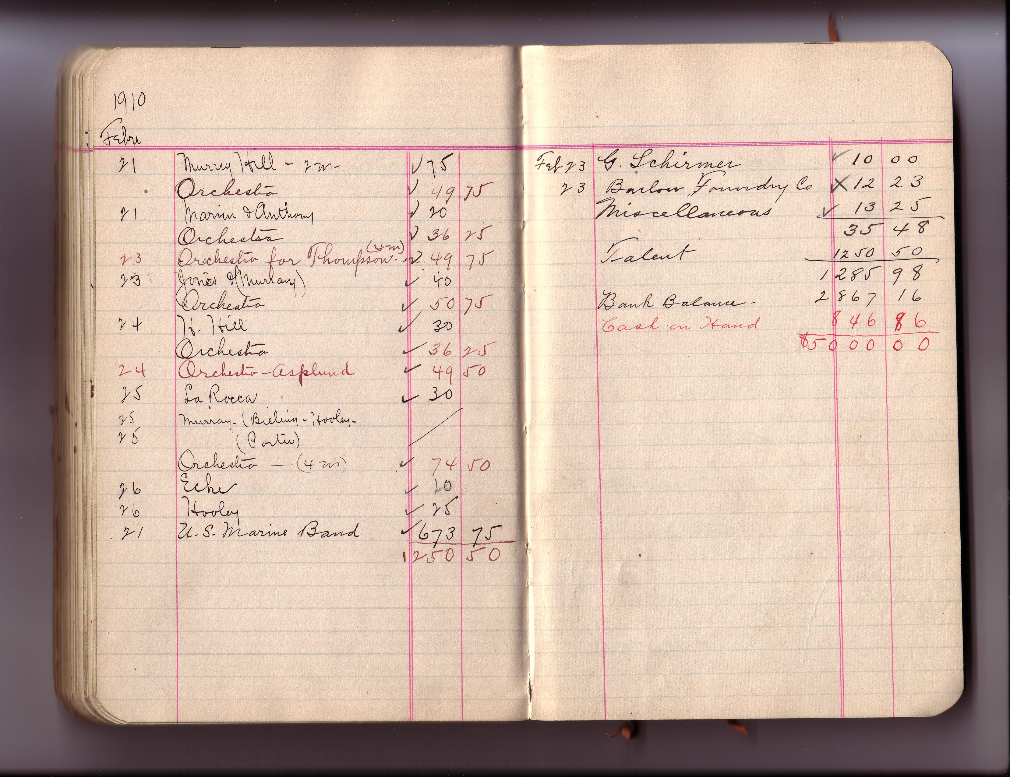 Thomas Edison's New York City Recording Studio Cash Book 05 (of 21), Image 78 (of 88). (Notebook #: PN-08-11-16, NPS catalog #: EDIS 1416), This book documents expenditures for recording artist fees and other payments authorized by studio manager Walter H. Miller from November 16, 1908 – April 01, 1910. Digitally scanned December 2004 through July 2005 at resolution 300 dpi, 24 bit.