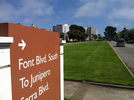 A sign in front of a green lawn says Font Blvd. South to Junipero Serra Blvd.