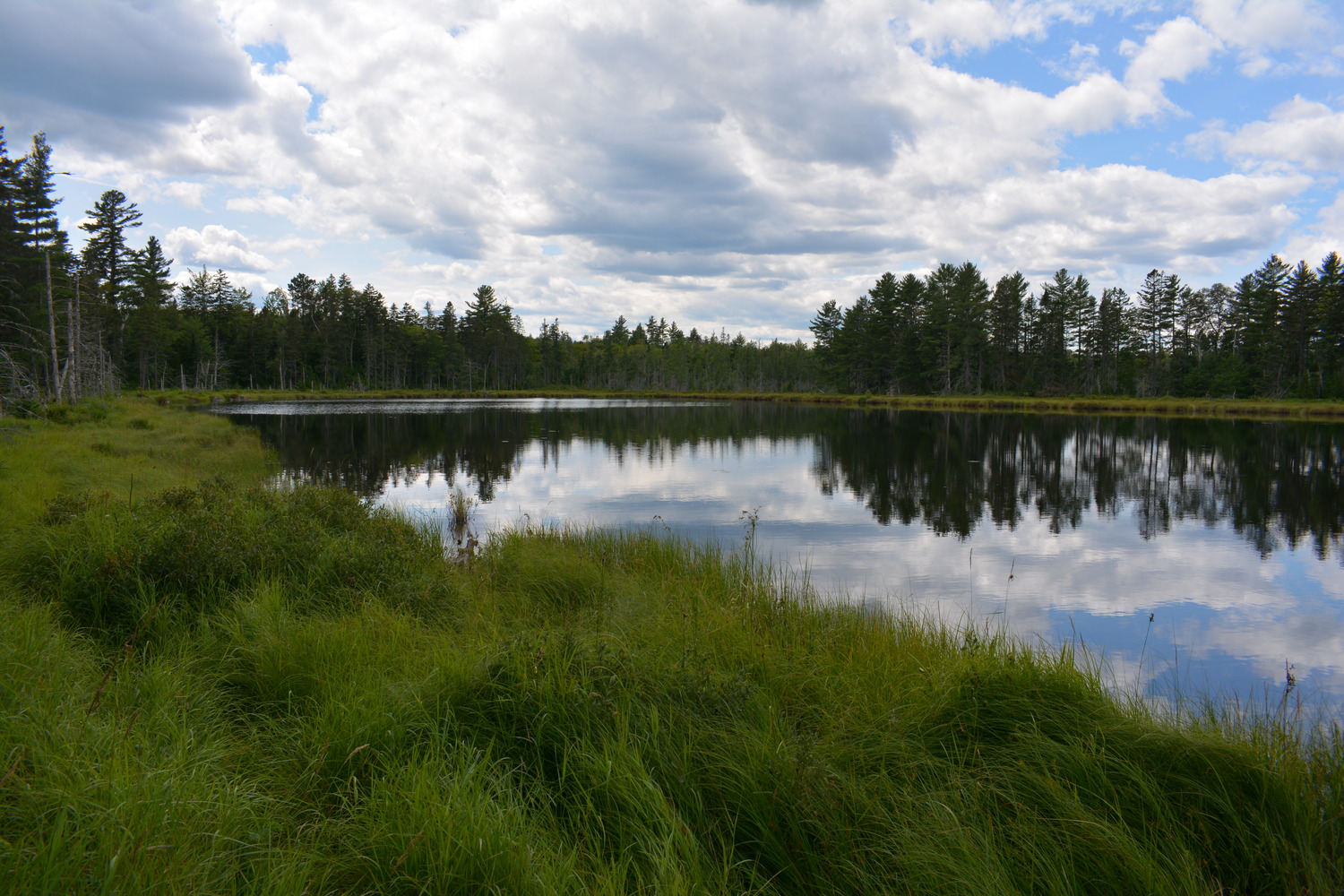 A pond surrounded by grass reflects the sky and trees.