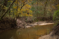 A small creek with murky brown water flowing through a forest, below a tree with yellow-green leaves in fall.