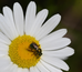 Golden sweat bee (Augochlorella aurata) female foraging on daisy.