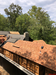 The roof of a long building that changes direction at right angles several times as it progresses into the distance is in the process of being covered with new cedar shingles. A group of green trees is visible above the roof in the distance with a cloudy sky above.