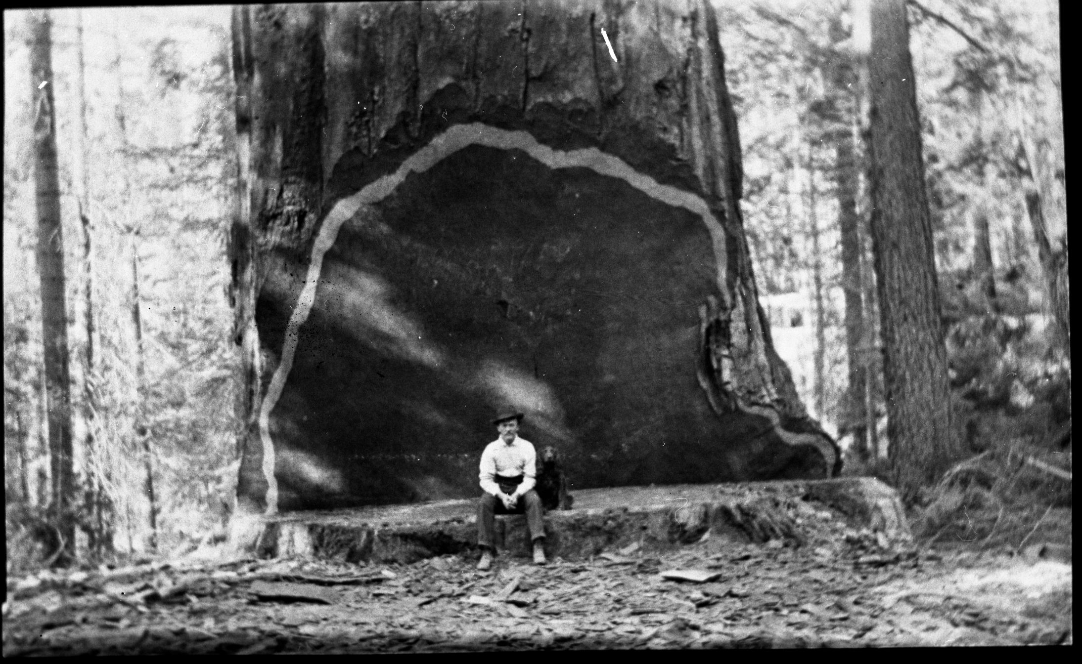 Unknown Photographer, Unknown Date, Millwood area, Giant Sequoia National Monument, Historic Individuals, Logging, Mr. Frank Kibler and dog. Remarks: Kibler was supervisor for Millwood.