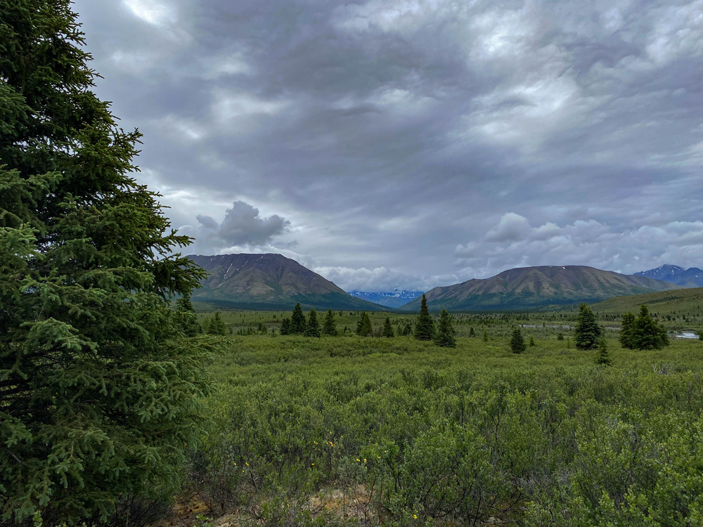 A gap in the mountains revealing more mountains in the distance under heavy cloud coverage