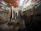Stalactites form hanging from the ceiling as water containing calcium carbonate drips down and leaves deposits behind
