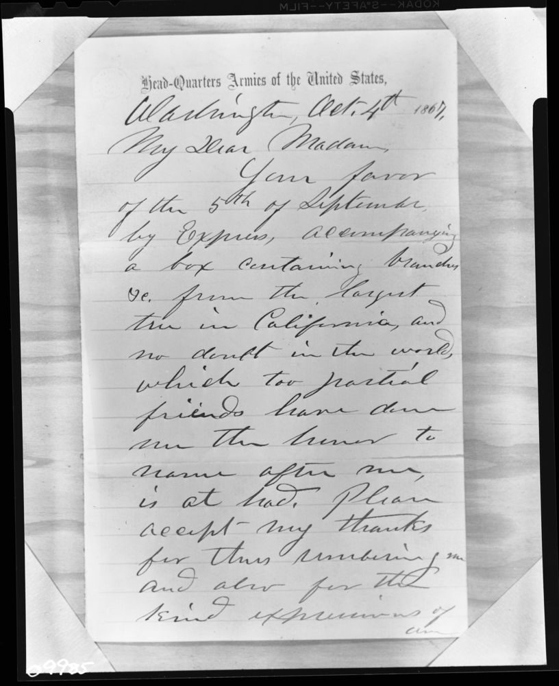 Maps, diagrams, etc., letter from General Grant to Mrs. Lucretia Baker acknowledging naming of Grant Tree.