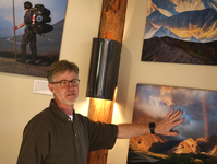 Volunteer photographer Kent Miller speaks to people at an exhibition of his photography in Denali