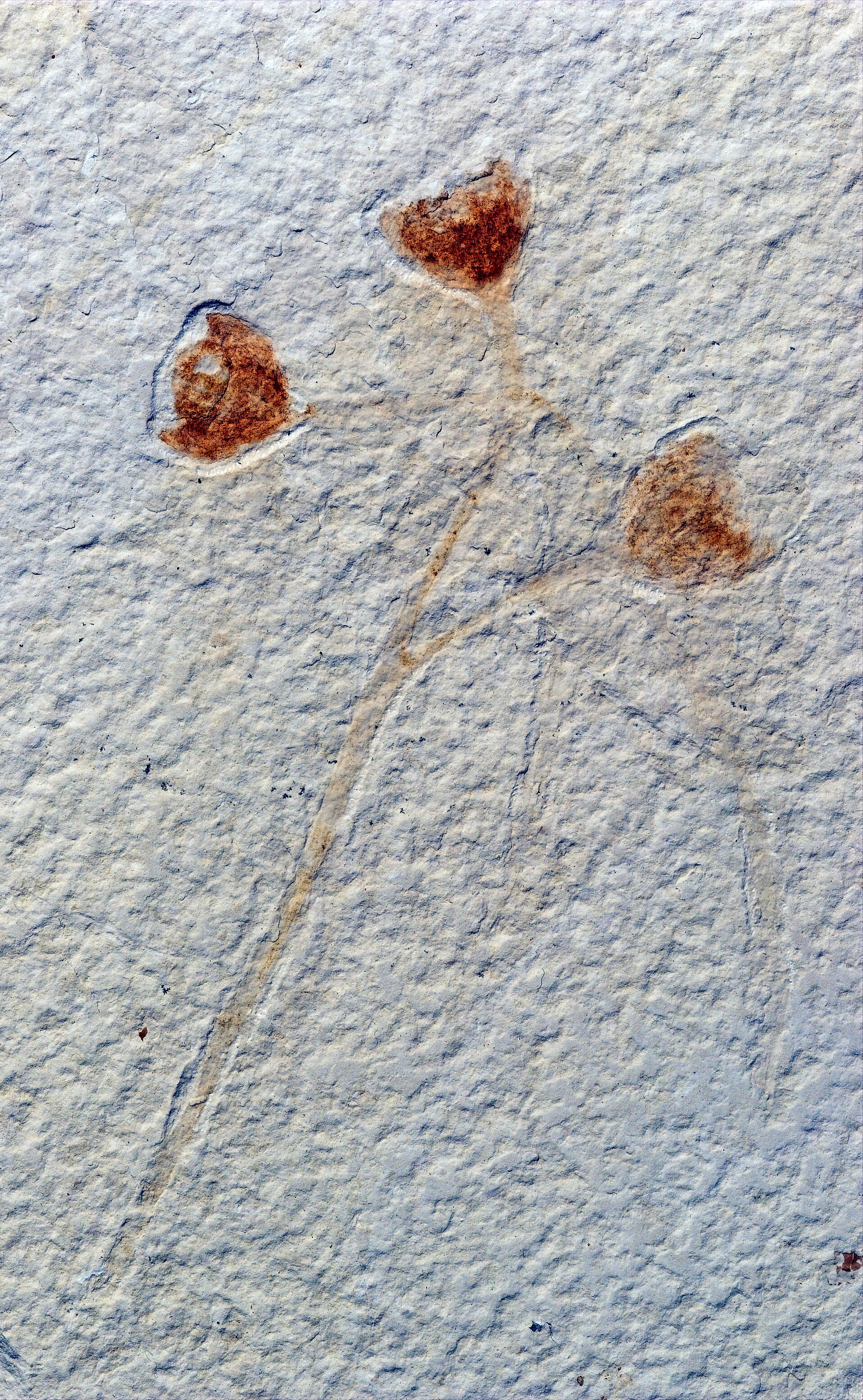 Fossil of a fruiting structure. The middle fruit is approximately 8.5 mm tall. Catalog number FOBU11637.