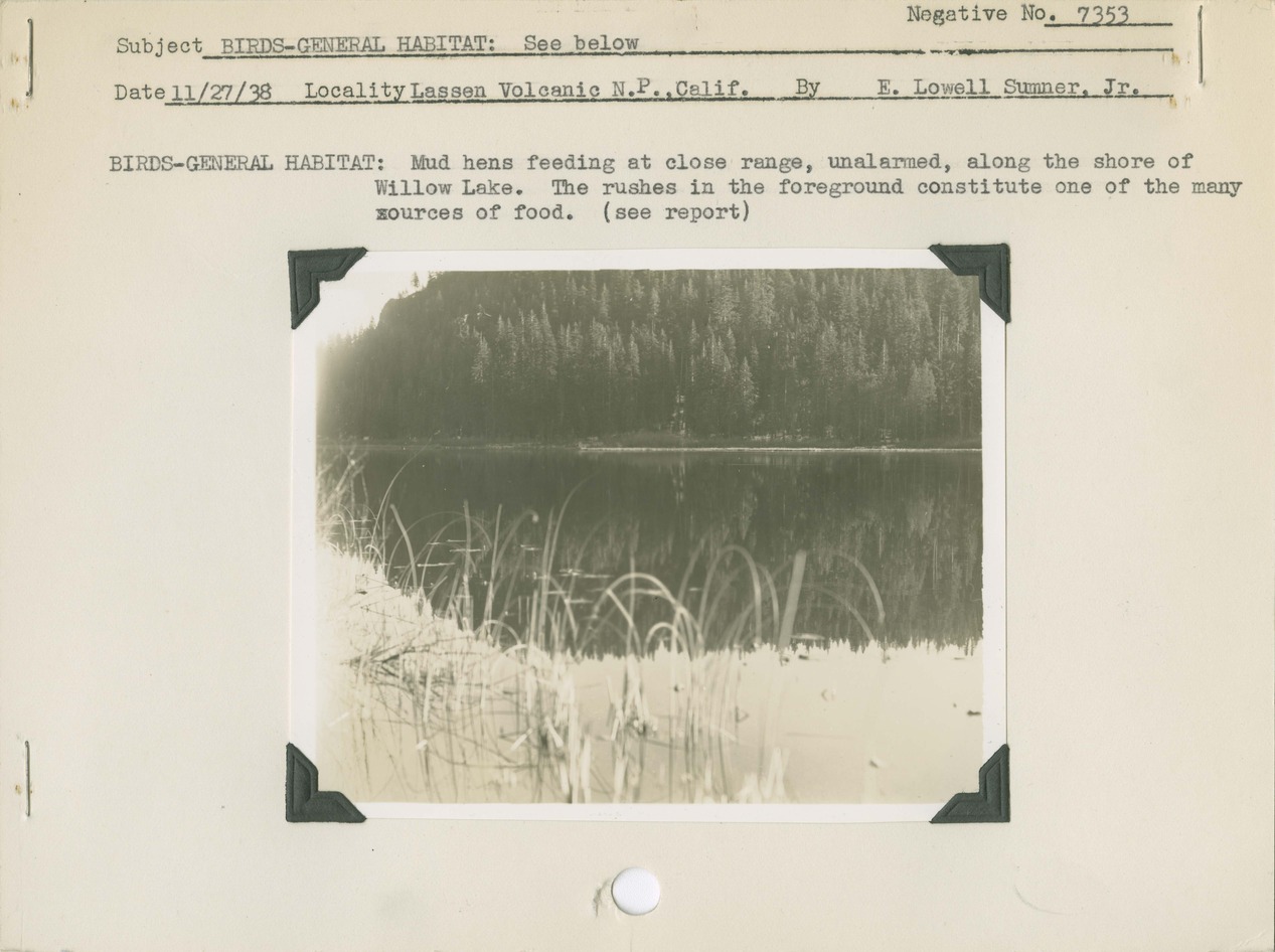 Birds- General Habitat: Mud hens feeding at close range, unalarmed, along the shore of Willow Lake. The rushes in the foreground constitute one of the many sources of food. (see report). Locality: Lassen Volcanic National Park, California. Negative #: 7353