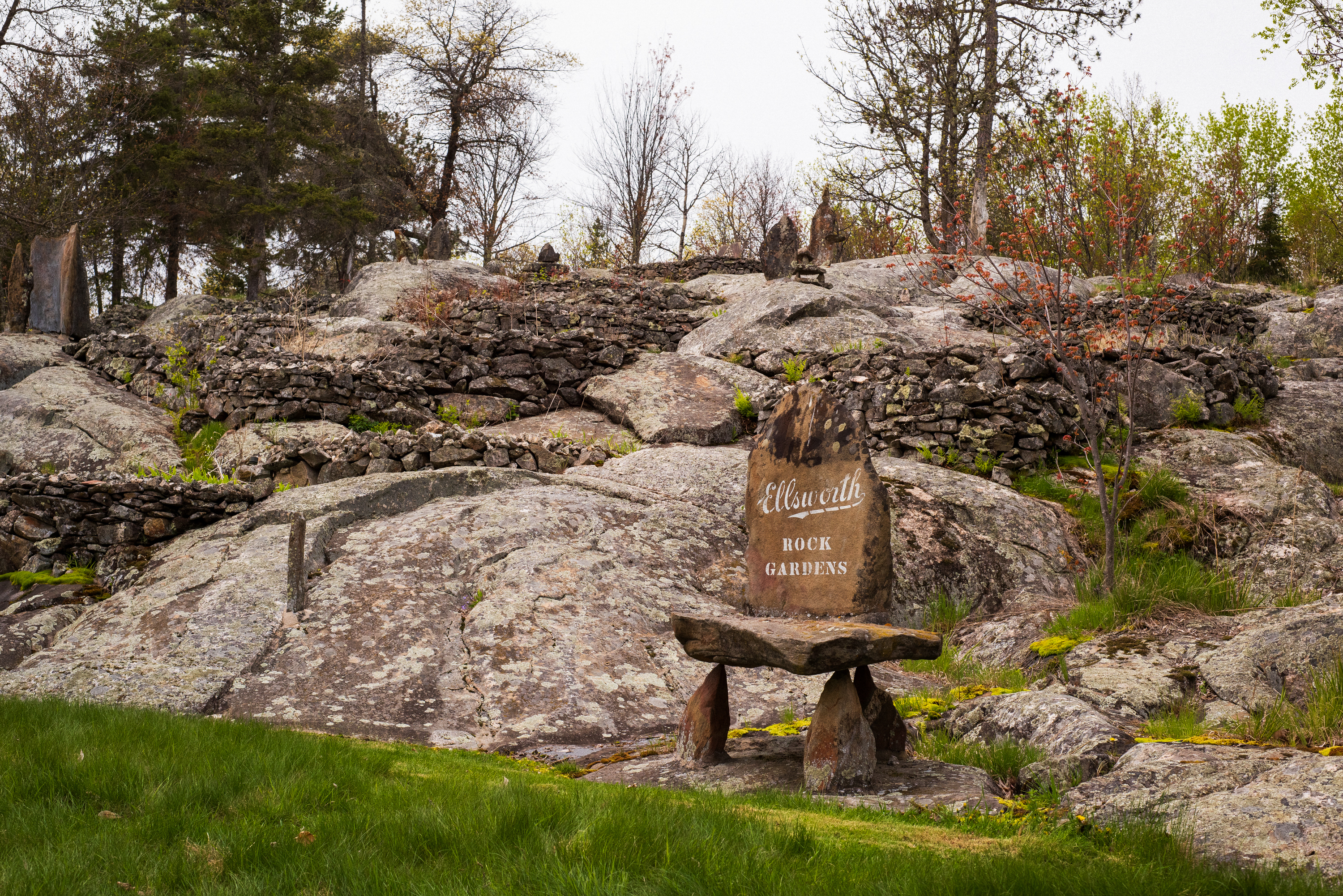 Photograph of rocky hillside with a sign reading "Ellsworth Rock Gardens."