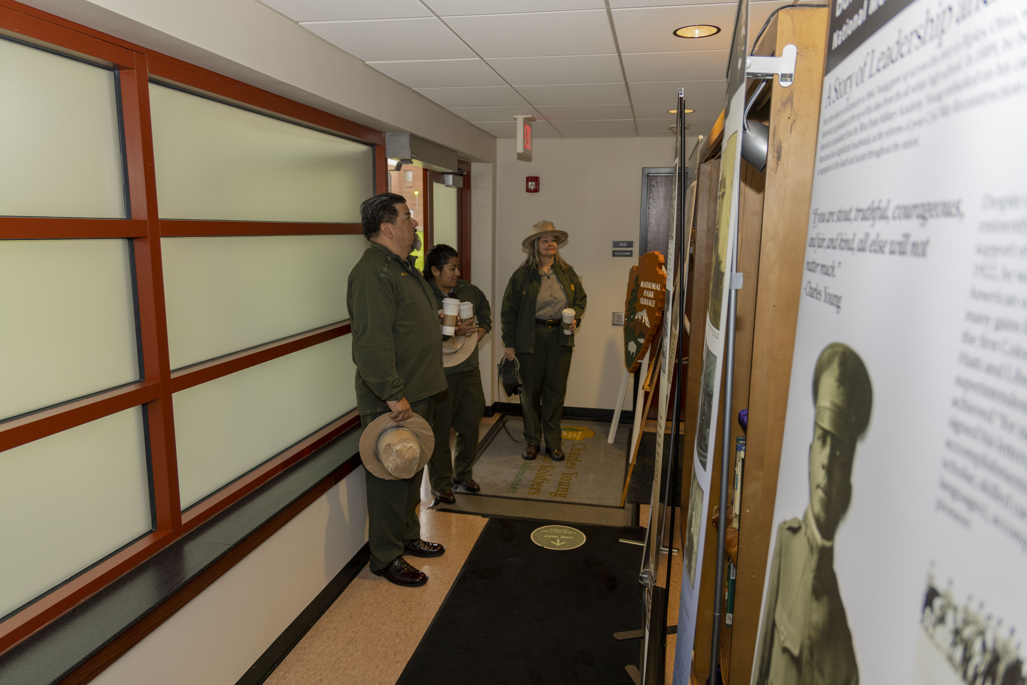 Director Sams views and reads interpretive displays on his way into the temporary visitor center.