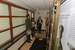 A man in a green uniform holds a tan flat hat and faces a wall of displays to read them.