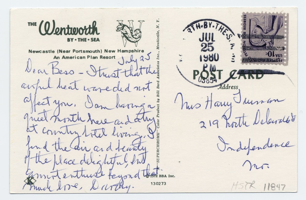 A postcard from Dorothy to Bess Truman. The postcard includes a photograph of a resort in Newcastle, New Hampshire on the front and a note written in blue pen on the back. The postcard was sent on July 25, 1981