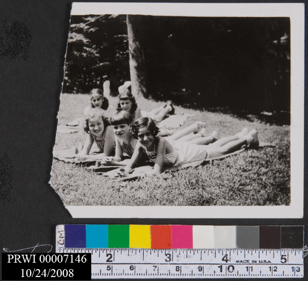 PEOPLE GIRLS ACTIVITIES<CRWRITTEN ON PAGE "FOOD REST HAPPY LEADERS=HAPPY CONTENTED CHILDREN"<CR5 GIRLS LAY ON BLANKET STOMACH DOWN PROPPED UP WITH ELBOWS PHOTO IN 2 PARTS<CR<CR<CRCATALOG # ON ARCHIVAL LINEN TAP LAID ON PAGE GLOVES IN HANDLING