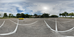 A 360-degree view of the Education Center parking lot. There is a light brown brick building covered in green banners. The parking lot has a few cars.