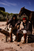 Native Americans sitting on a log with a horse behind them. One of them is holding a spear.