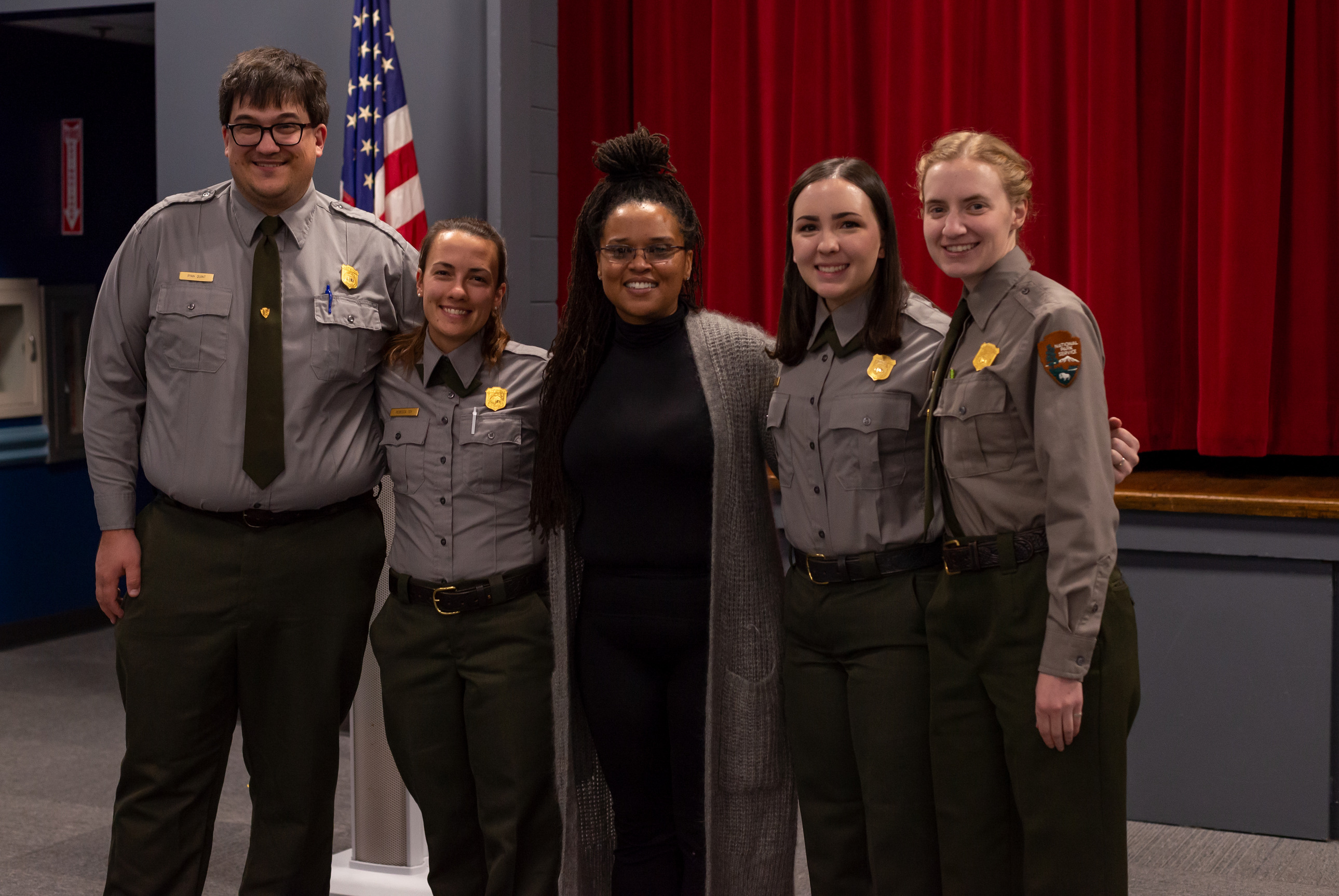 Four park rangers and a woman pose for a picture.
