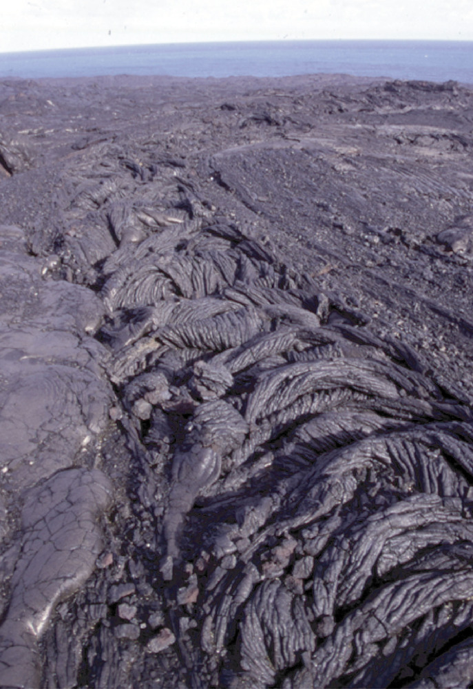 Pahoehoe lava has a smooth, ropey surface, formed when the lava is very hot and free-flowing. Hawaii Volcanoes National Park.
