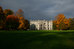 A grand three story stone house set on a vast lawn with large trees.