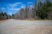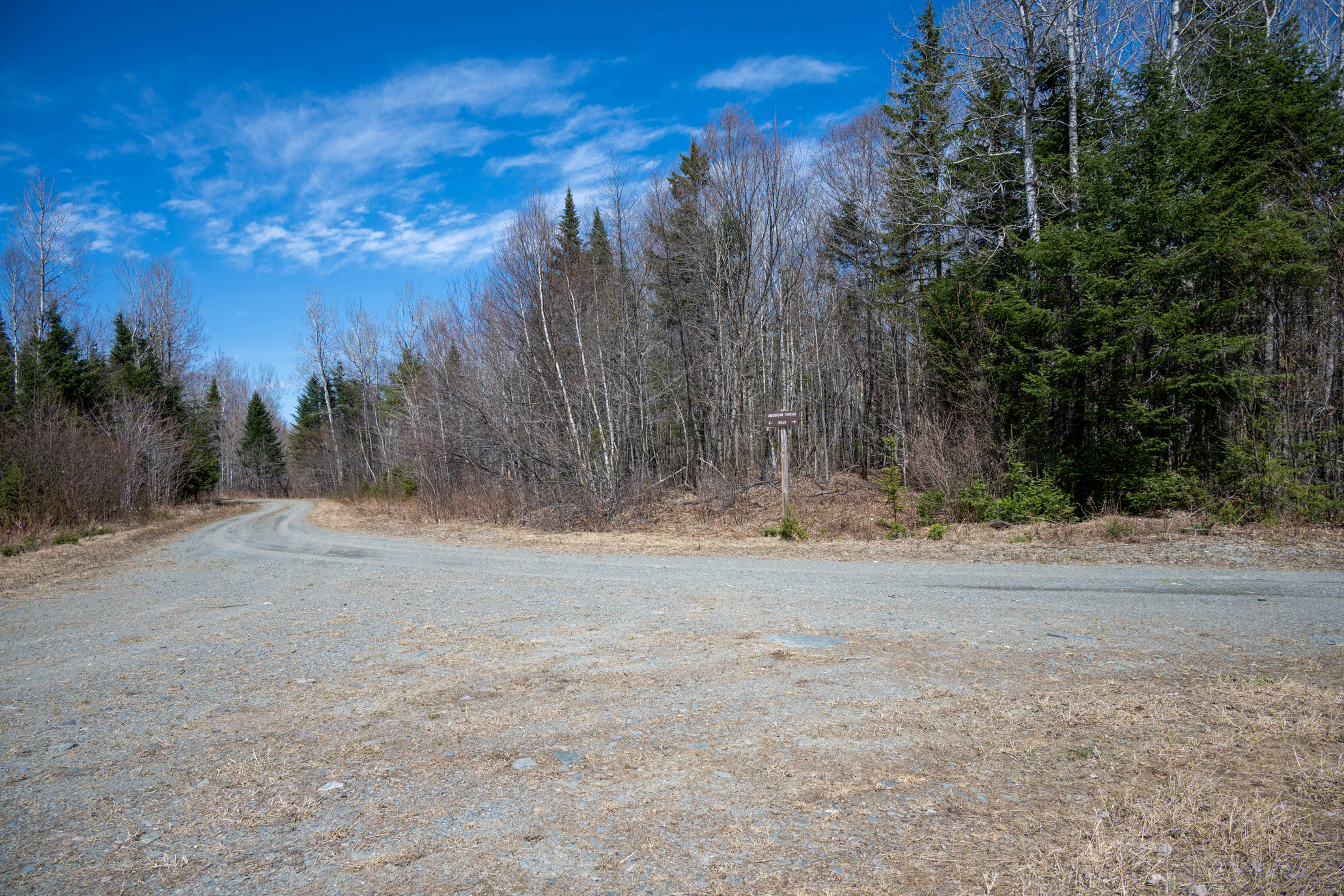 A gravel road under cloudy blue sky with sparse trees in the background
