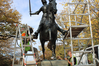 A Conservator welds the foot of the Joan of Arc statue, while the other conservator buffs and paints over the aged tint of the bronze statue.