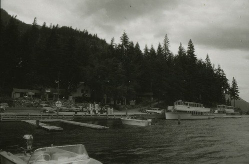 View of Stehekin Landing from Lake Chelan. (North Cascades NPS Complex Museum Collection, NOCA.0002 Assembled Collections, Series V: 1963 NPS North Cascades Survey Photographs, Subseries A: Prints and Negatives, File 276m)