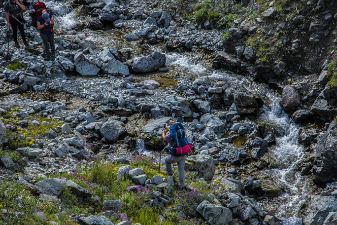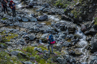 three people hiking up a rocky mountainside next to a shallow, swift creek