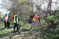 A group of four individuals are cleaning up litter along the edge of a wooded area. From left to right: a person in a blue hooded top and orange safety vest uses a trash grabber with a black bag; a person in a red shirt and dark pants holds a black bag; a person in a bright yellow-green safety vest over dark clothing holds a black bag and a trash grabber; and on the far right, a person in an orange and black safety vest is bent over, picking up trash from among dense bushes and fallen leaves, also with a black bag. The trees above them are mostly bare, but there is new green foliage on the bushes and ground.