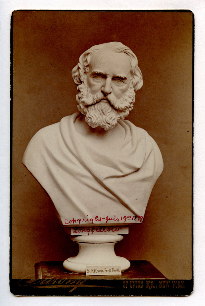 Photograph of Henry Wadsworth Longfellow portrait bust by Samuel Kitson. Bust is standing on a square table with label "S. Kitson. Fecit Roma" at its base. Inscription: "Copyright July 19th 1879 / Longfellow" written in red ink in cursive on bust. "Compliments of / Samuel Kitson / Sculptor" written in cursive verso. Photographer's imprint includes "Sarony / 37 Union Sqr., New York." Notes: C1879. Assumed photographed relatively soon after 19 July 1879 copyright date. Associated Materials: 3007-1-2-1-97 shows slightly different angle of statue.