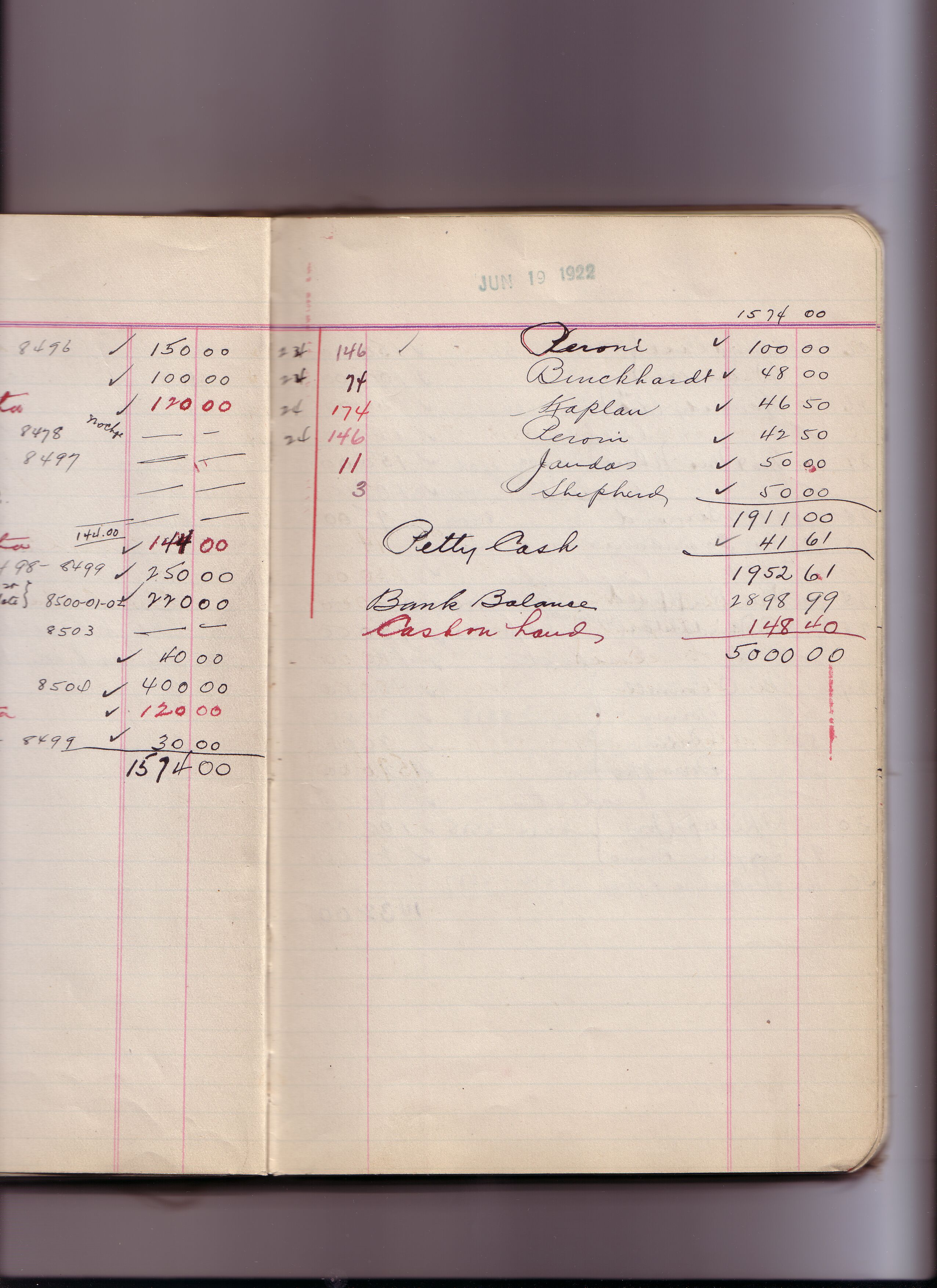 Some of the markings made in pencil in these cash books were made by ENHS Curator Leah Burt during the 1970s and/or early 1980s. For Leah Burt handwriting examples see pages for: December 19, 1921 (cash book 17) ; February 12, 1923 (cash book 17) ; October 27, 1924 (cash book 18) ; December 01, 1925 (cash book 19).