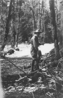 District Ranger J.W. Fulton repairing telephone line on North Fork Quinault. (He has a piece of moss in his right hand.)