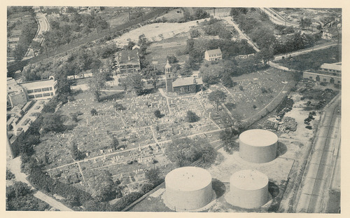 Aerial view of St. Paul's Church and cemetery, in the 1930s, reflects a growing industrialization of the vicinity.