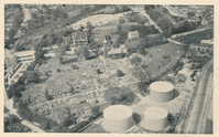 Aerial view of a church, adjoining cemetery, small buildings, streets and large industrial storage tanks. Trees and elevated railroad line are also visible.