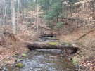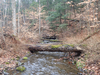 Site visit photo showing the upstream (UP) or downstream (DN) view of a wadeable stream reach taken during benthic macroinvertebrate monitoring at Delaware Water Gap National Recreation Area.